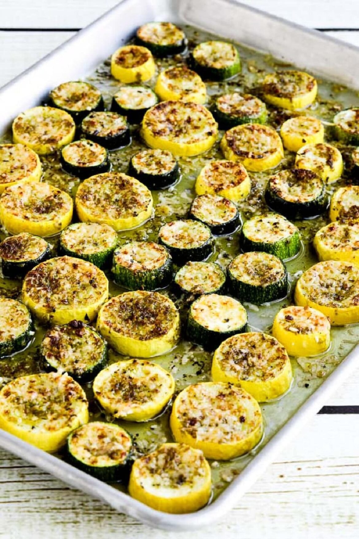 Summer Squash with Pesto and Parmesan shown on baking pan